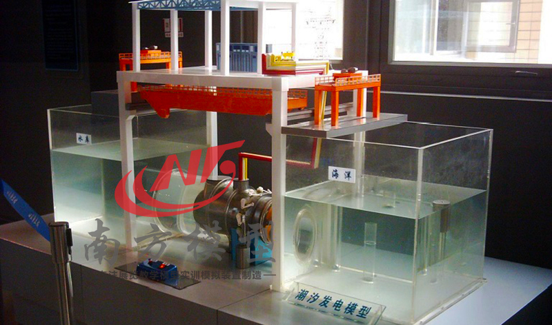 潮汐發(fā)電模型 通過出水庫,在漲潮時將海水儲存在水庫內(nèi),以勢能的形式保存,然后在落潮時放出海水,利用 高、低潮位之間的落差推動水輪機旋轉(zhuǎn)帶動發(fā)電機發(fā)電。在有條件的海灣或感潮口建筑堤壩、閘 門和廠房,圍成水庫,水庫水位與外海潮位之間形成一定的潮差(即工作水頭),從而可驅(qū)動水輪