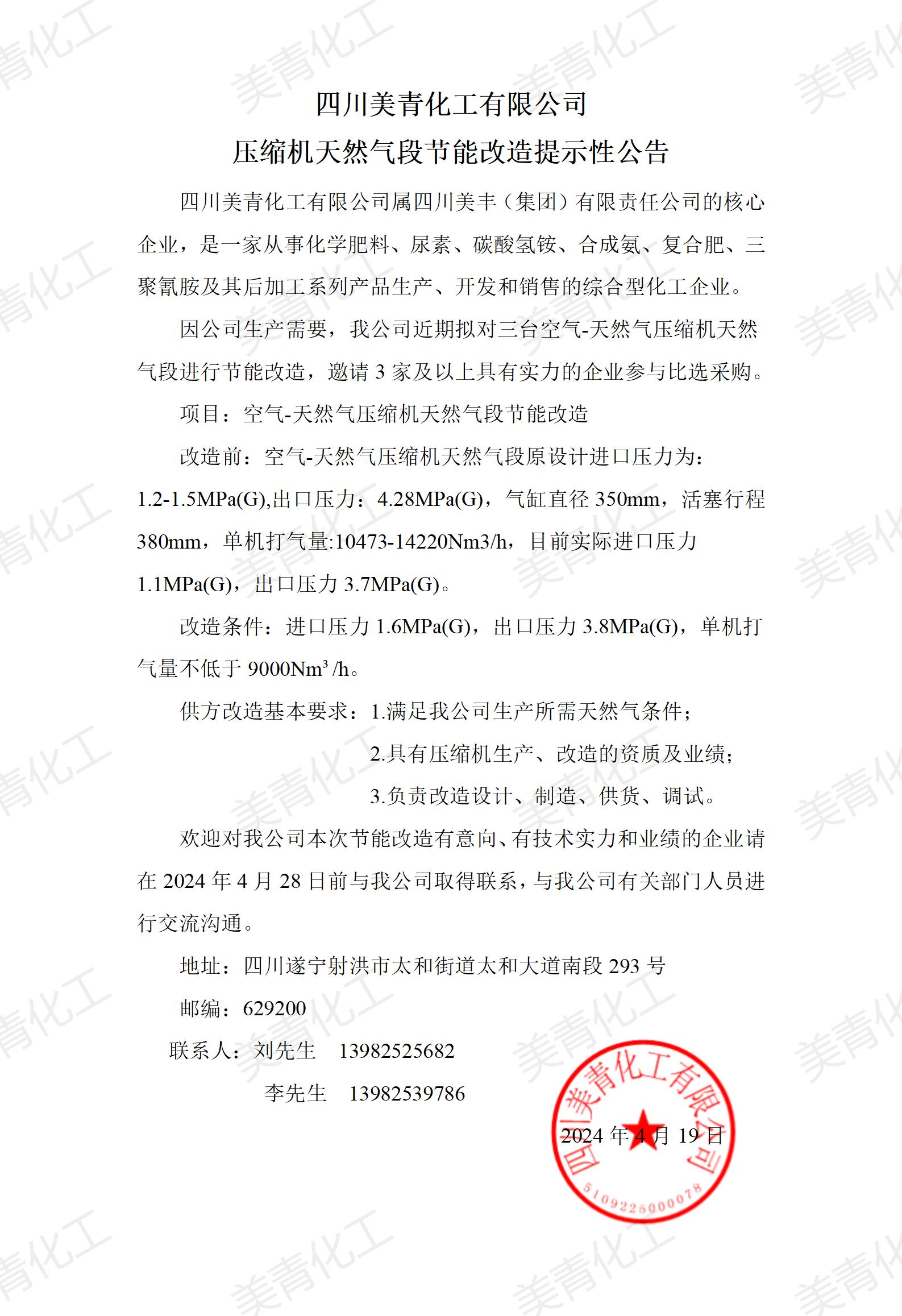 壓縮機(jī)天然氣段節(jié)能改造提示性公告